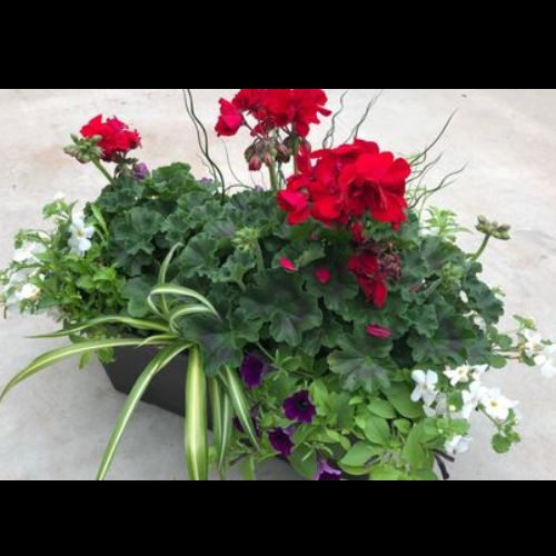 This lovely window box is a sure hit with gardeners. It contains Geraniums, Petunias and Impatiens. (18 inch)