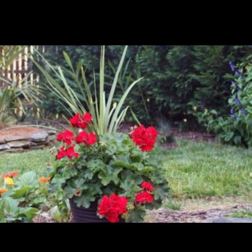 Our hybrid red geraniums keep blooming and growing all season long. Spikes and vines make this a complete summer planter. (12 inch)