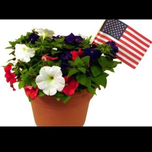 Red, white and blue petunias in a container with flag. Will be delivered to National Veterans Cemetery on behalf of the group. Will NOT be delivered with other products. (see Bedding Plant brochure product "D" to receive this product for your home) (10 inch)